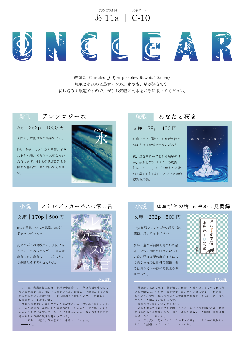 #COMITIA122頒布 #コミティア 23日(木祝)のおしながきを作りました。いつもの短歌集に加えて作品集 #空アンソロ と、表紙撮影者さんお二方のポストカードがあります。見に来るだけでもお立ち寄りいただければ嬉しいです。〔け60ab〕でお待ちしています。 pic.twitter.com/dKF5lglHLV
